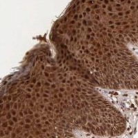 Immunohistochemical staining of human oral mucosa shows strong cytoplasmic and nuclear positivity in squamous epithelial cells.