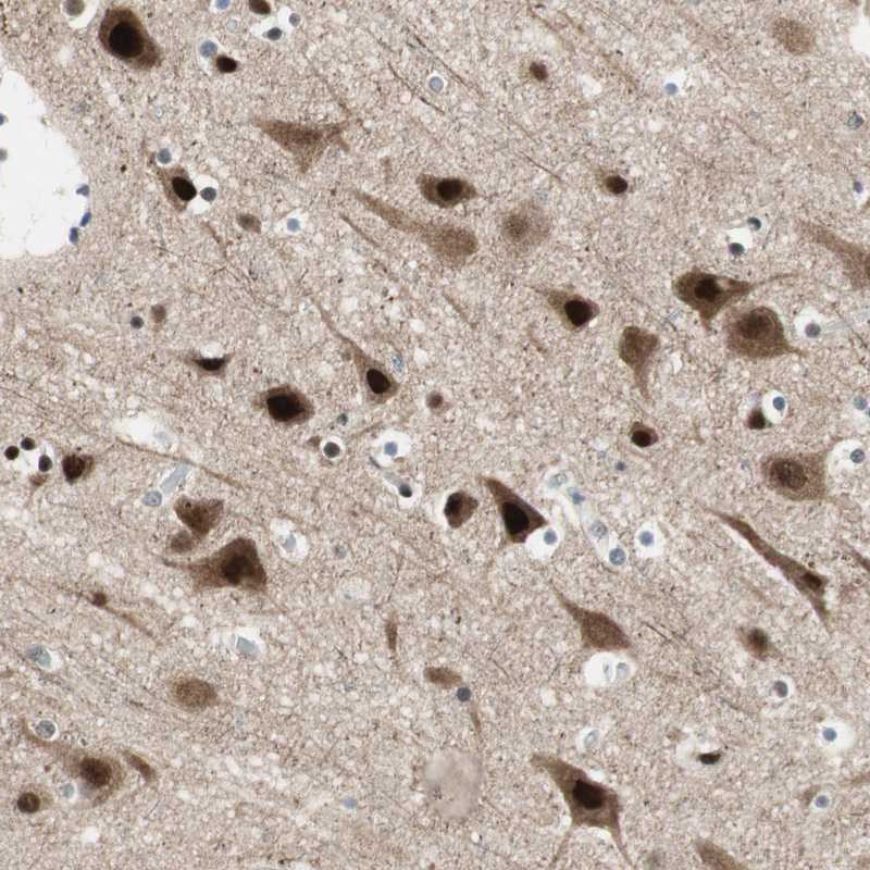 Immunohistochemical staining of human cerebral cortex shows strong nuclear and cytoplasmic positivity in neuronal cells.