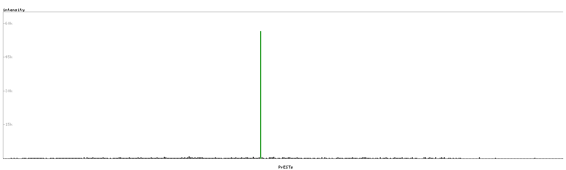 At the top of the view, the position of the antigen (identified by the corresponding HPA identifier) is shown as a green bar. A yellow triangle on the bar indicates a <100% sequence identity to the protein target.